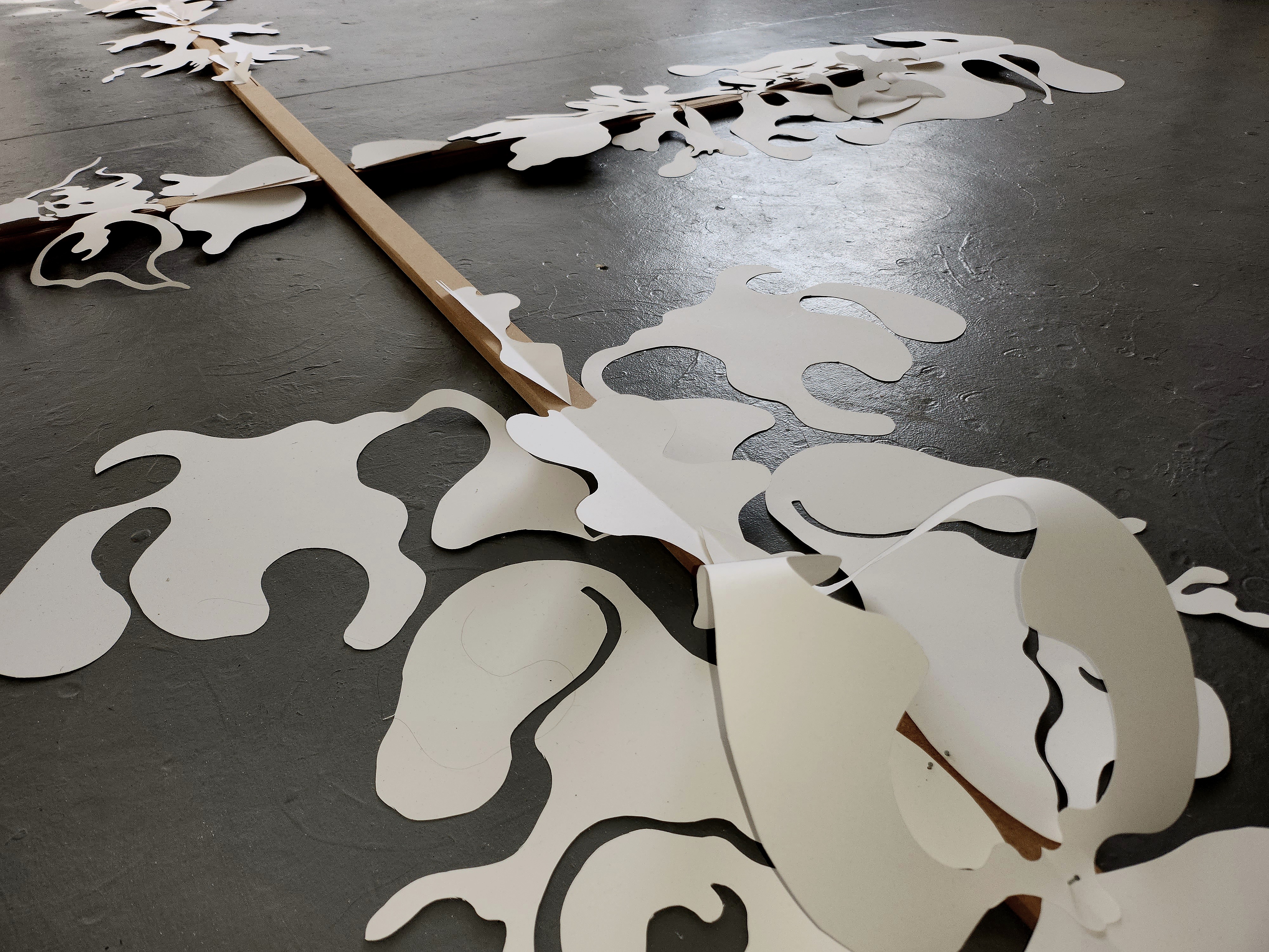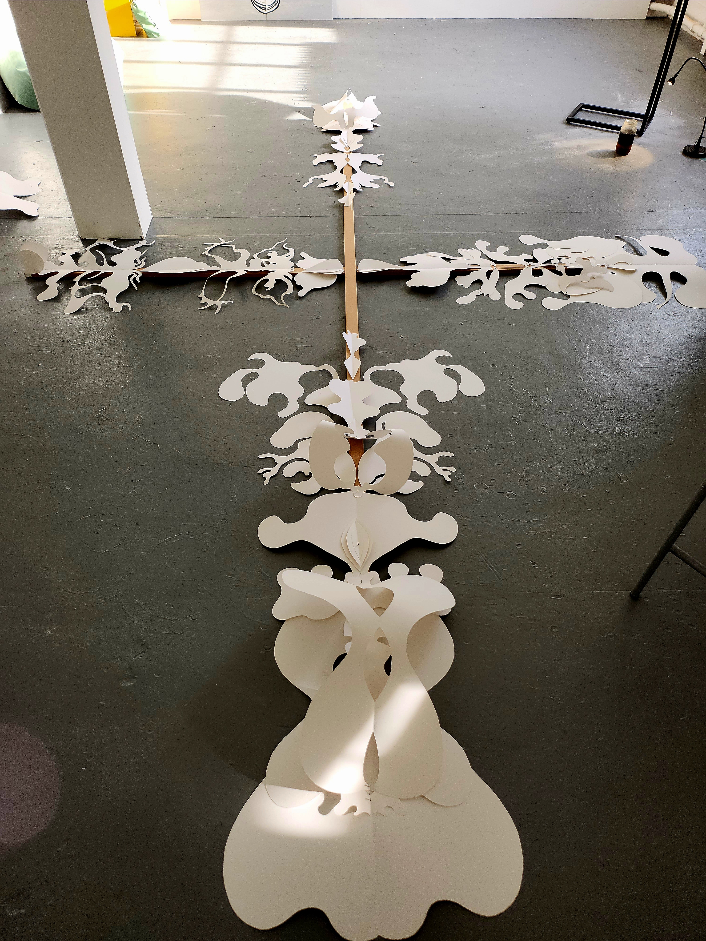 Paper-stock did come up. I am hesitant to introduce colour at this stage in my process. Reason being that I want to avoid convoluting what I haven’t quite figured out yet. Saying this, my next movements will be to further the spacial qualities in the work. The cross can become raised and no longer situated flat on the floor. I also want to explore the possibilities of forming a more monumental structure. I shared my plans to create a clock-hand-like formation that spirals up from the ground. Angus mentioned the power and symbolism of the cross as something diagrams the separation of two levels, or two worlds. Two realities. I will consider introducing more geometrical shapes within the organic cut outs. And to see how this would interrupt or heighten compositional qualities in my work.