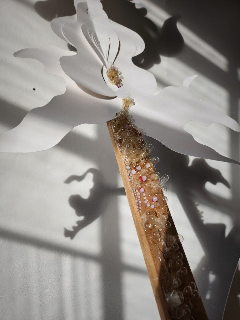 I have been adorning my sticks with empty capsules made from gelatine. These clear capsules can be popped apart & once adhered to the fleshy brown hues of the unrefined wooden stick they appear like some sort of oozing surplus.
