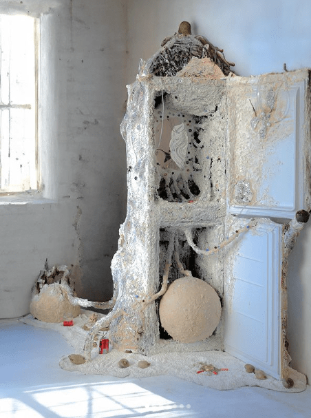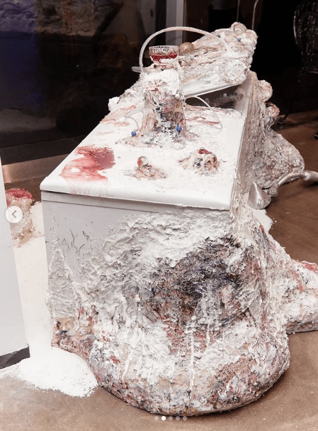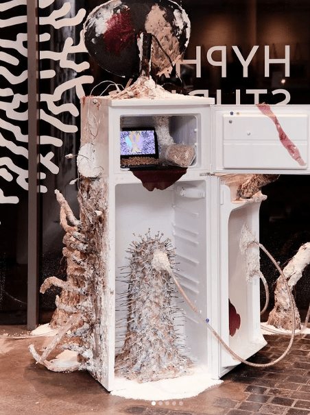 When we observe this artwork, we see more than the white good. But, its ( a fridge) very presence as assemblage can not be ignored. Of course, Perini has worked to adorn the fridges’ formal qualities with more lifelike representations of movement and bodily function. Tubing sends semi-sentient signals to unknown spaces. and material that seems to expand on its own accord. Ribbed inlays where shelves can lay create a new structure for this being that can’t quite exist yet. Because we can’t name it. This overlay of recognised and signified opens up the subjective question of beauty?