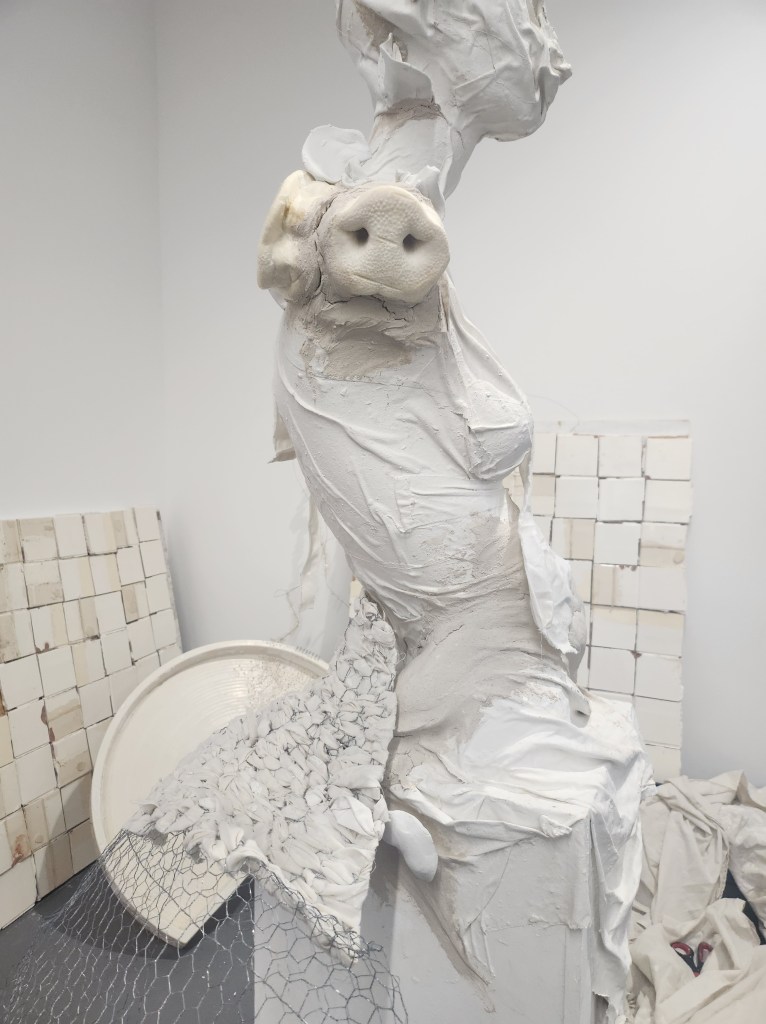 Another avenue I explored was an alternative way of utilising the dust sheets used to form Sculpted Sentients. Instead of draping the textiles, I created a structure that would expand the sculpture. The weave was semi-successful, what bothered me was the appearance of the two textures together. They didn’t seem to flow in the way I wanted them to. However, the colour story is in keeping.