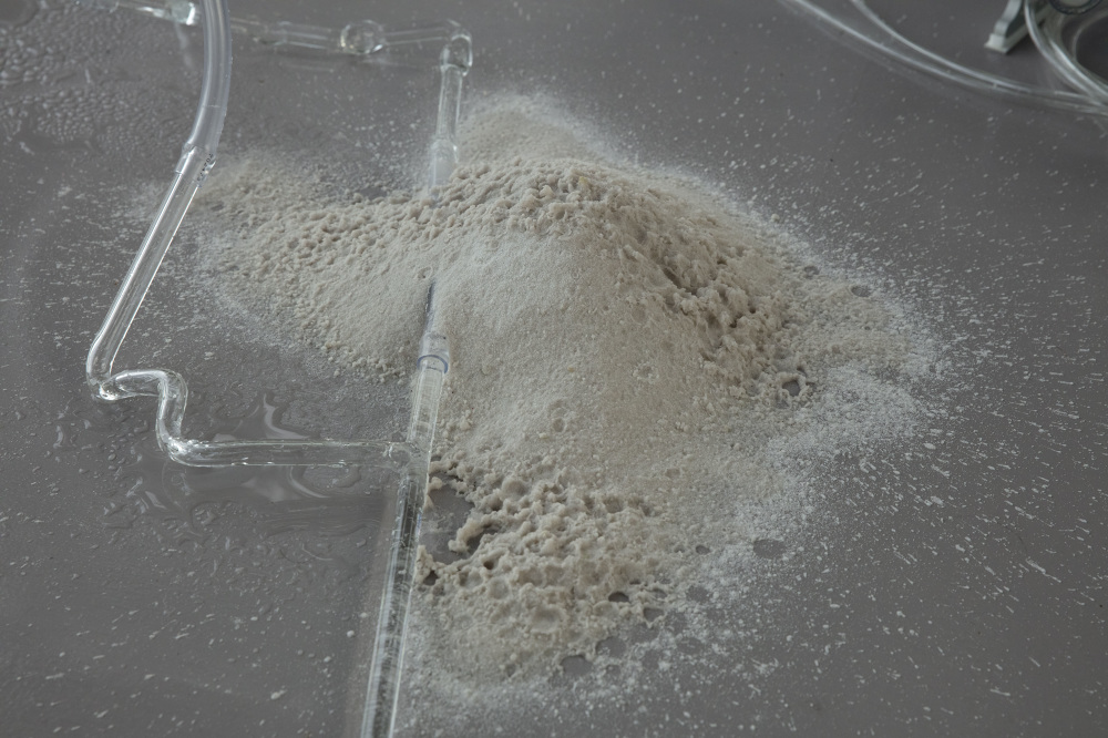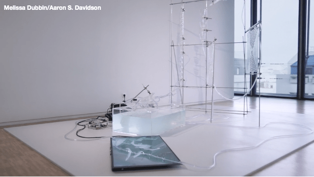 DETAIL // Water from subterranean Asahi River, borosilicate glass, overclocked water-cooled computer, soft robot manta, silicon boules, temperature sensors, micro-controllers, air compressor, air control system, simulated environment, monitor, metal, plastic and power supplies.