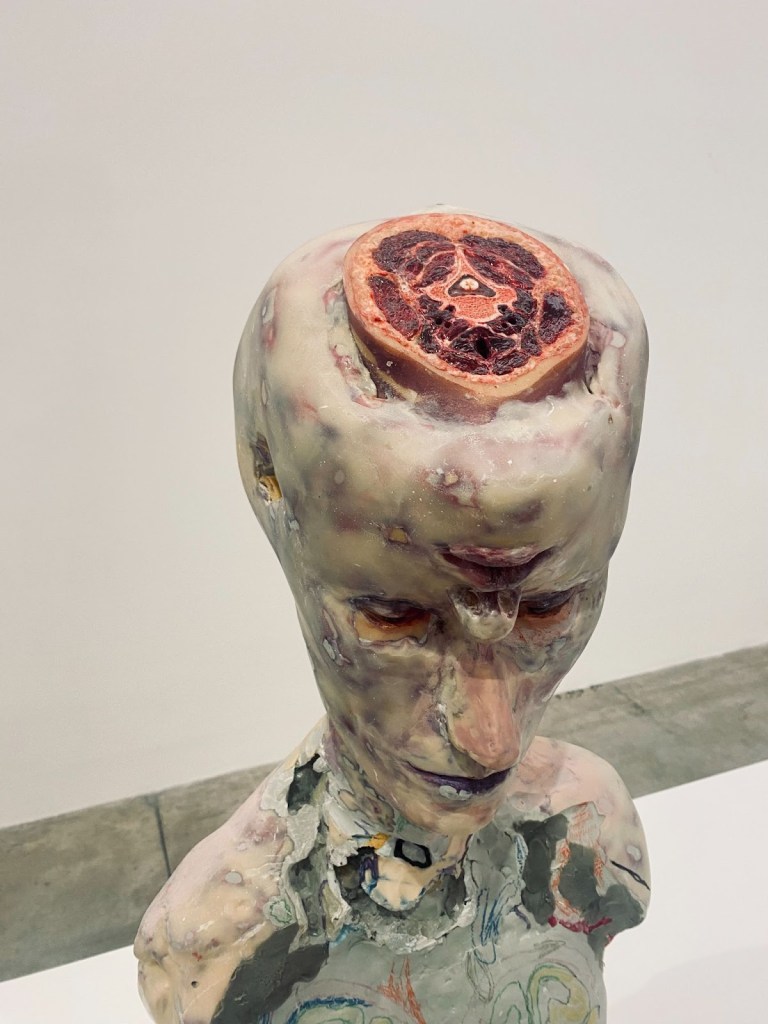 On the lower ground floor, Altmejd dutifully presents us with a sculptural colony for his first show with White Cube in London. In the gallery walkthrough video accompanying the exhibition, Altmejd alludes to a sense of surrender. A point in his creative process where the work becomes intelligent enough to make its own choices. “I feel like the object has made itself and I just helped it make itself.”1 We could liken this to the coming of age tale as old as time. The question is from which perspective do we see the artwork ensuing? Childhood or adulthood? Two distinct stages in life become ambiguous as you descend into the sculpture court festering beneath The Vector. Altmejd’s show is an invitation to be playful with this balance. He makes it clear in this confusion that an ever changing combination of elements define our personality. As you weave amongst the plinthed busts, Altmejd’s creations ooze some sort of unknown familiarity. A resemblance of the artist’s anthropomorphised personality. Human features morph seamlessly into cartoon-like characteristics of the hare. When we look at the sculptures the ambivalence of naivety and wisdom is palpable. Glaring through us like refracted light. It’s blinding, as we come face to face with each individual bust. Some appear to be cross-sectioned cliff edges, weathered and eroded over time. Layers of colour and texture tear through each other revealing scribblings not too dissimilar to what you’d find magnetised onto the family fridge. On closer inspection the doodles look like crude diagrams of bodily organs. Bulbous intestines drawn with crayons create passageways through the sculpture’s surfaces. “One way in which sculpture can function like a body is to suggest that the body contains infinite space.”2 It is true that the human mind is not finite like the space around it.
