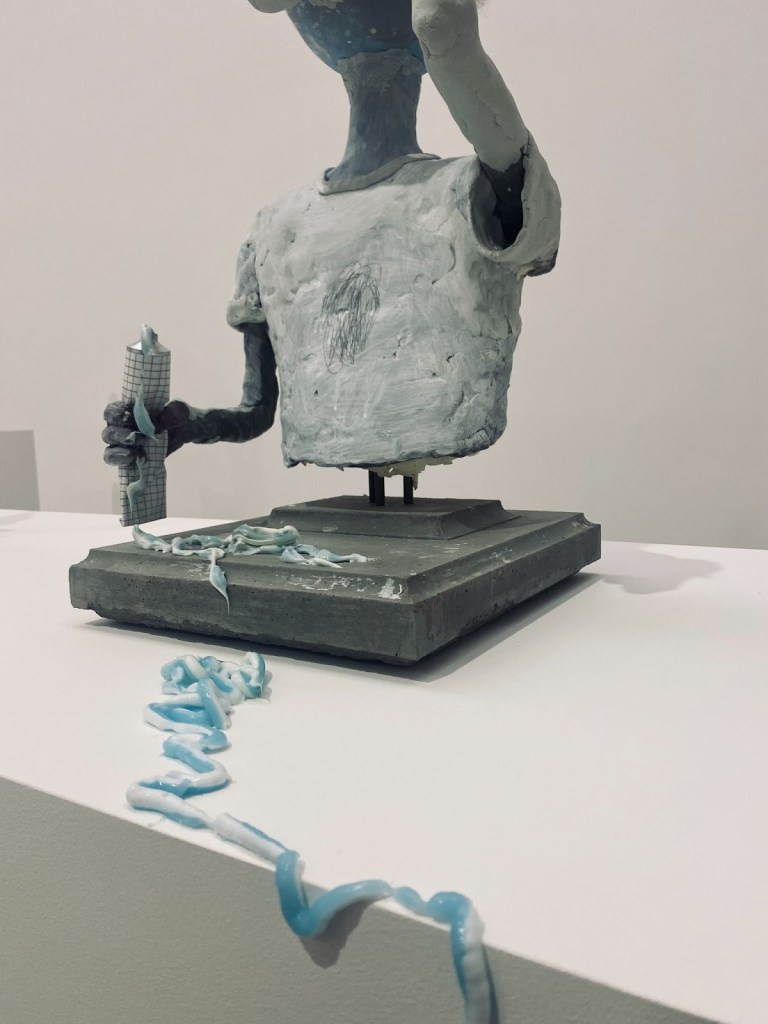 Some of the sculpture’s surfaces look like a geographical graph. Or a map of knowledge. Dense lines indicate high points and other markings create alternative terrains. Throughout the space we continue to see Altmejd’s nod to the trickster mentality. Toothpaste has been squeezed erratically over the plinths and onto the gallery walls. It seems we know who the culprit is. ‘Glitch’ grips a tube of the stuff in one hand and in the other, he thrusts a toothbrush toward its rodent buck teeth.