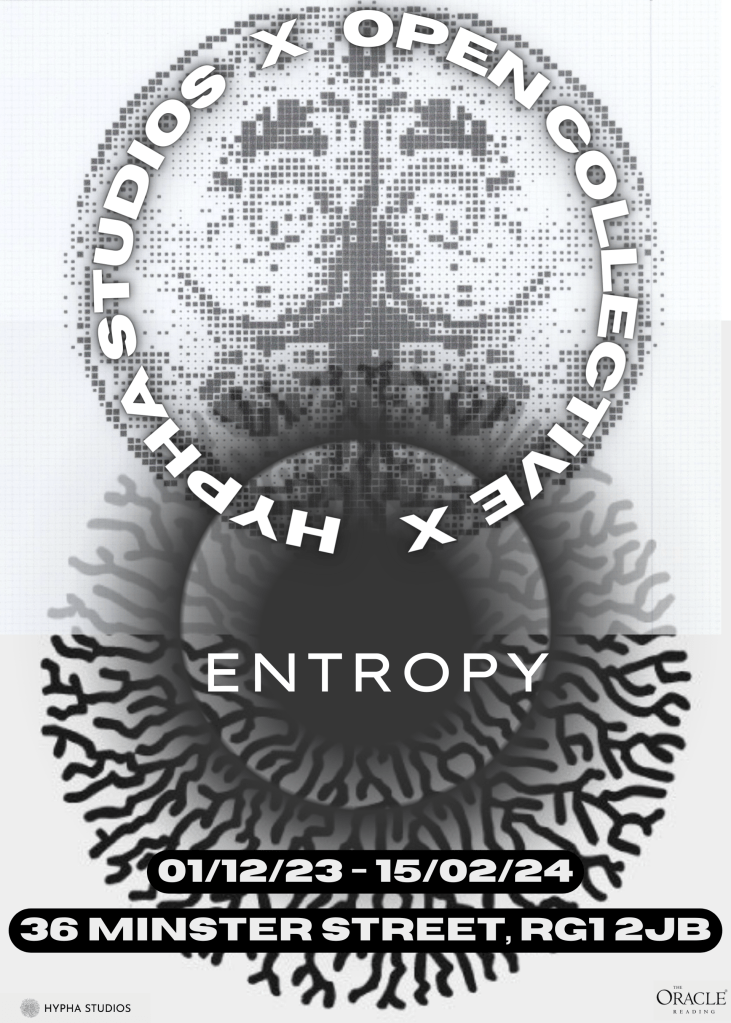 ‘Entropy’ occupies a disused shopping unit in Reading’s The Oracle shopping centre – 36 Minster Street. This exhibition is supported by Hypha Studios. For further information please see hyphastudios.com To keep up to date, follow our instagram: @open_collective_