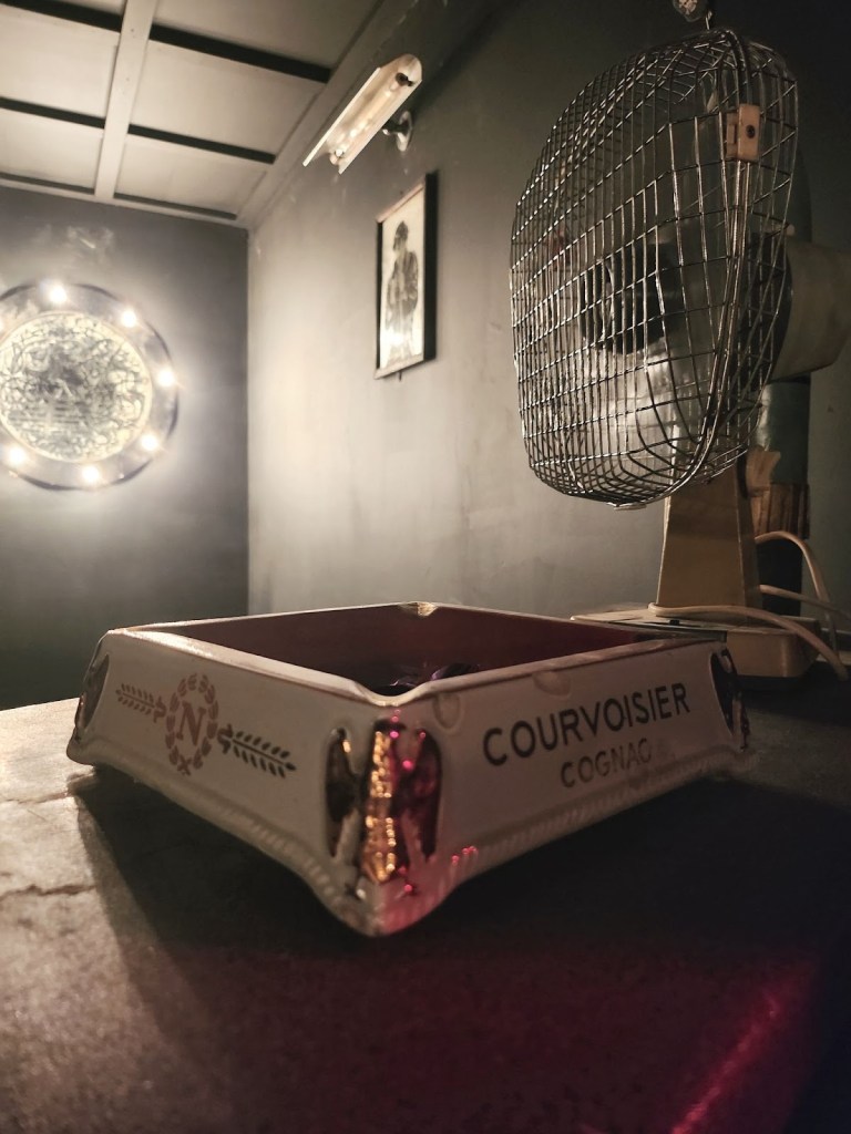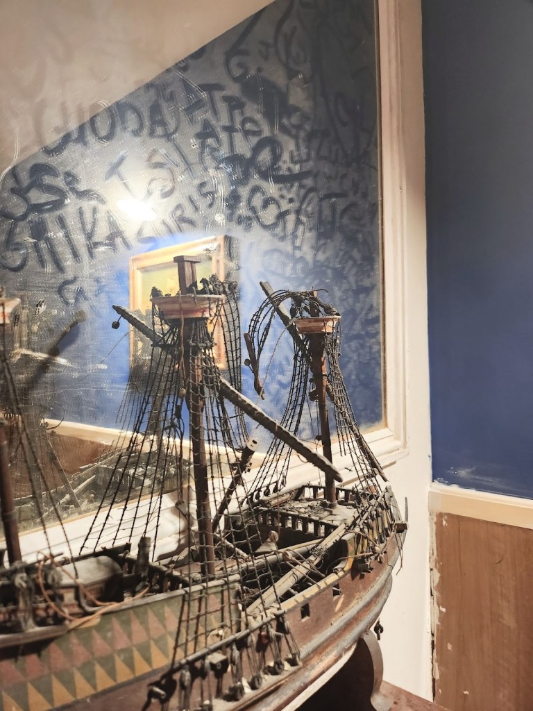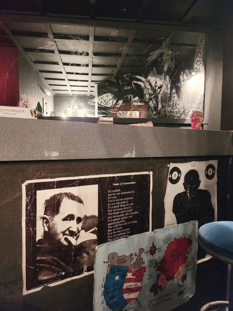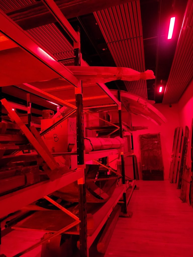 The incandescent hum of I, Impostor’s half full half empty space, purrs through three industrial sized shelving units. Serving up a dystopian Ikea warehouse. Where all of the furniture remains in its flatpack state, fizzling out into the realms of ‘unfit for purpose’. But of course each gaudy chandelier, and unidentifiable piece of metal work, each disused door and rusted garden fence chained together with limp defiance were the components of one of Nelson’s largest installations to date. I, Impostor, was originally conceived for the British Pavilion at the 54th Venice Biennale back in 2011. Ours truely; Mike Nelson, twice nominated for the Turner prize, studied at The Reading School of Art from 1986 to 1990 for a BA in Fine Art before achieving an MA in sculpture at The Chelsea College of Art in 1993. And here, at the Southbank Centre we are reminded of the tendency of temporality in installation. So what is installation if what we experience within gallery walls was never and will never be a naturally occurring sight? Installation today is the mapping of annexed items in correlation to their distant and disconnected meanings. Nelson’s considered composition of lonely materials, forbidden from touch for so long, seemingly transform into a maze of sensory experience. A mise-en-scene of matter that forms this deja vu of replicated installations. Nelson’s meticulous artificial interiors and re-imaginations of his previous installations beat AI image generators at their own game. When presented in this way, each dismembered relic of old immediacy in The Deliverance and The Patience; the cigarette butts stashed away behind cumbersome landlines, peeling political posters and praise for communism amongst naff memorabilia that has not aged well act as the very fictional fibers that thread together the narrative of stagnating time in this lost space.