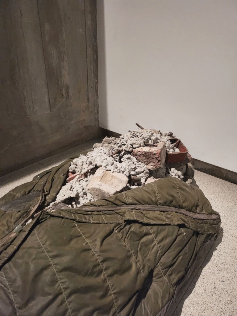 Mike Nelson, Untitled (Public Sculpture for a Redundant Space). Sleeping bag, rubble, concrete. Hayward Gallery, Southbank Centre. 2023.